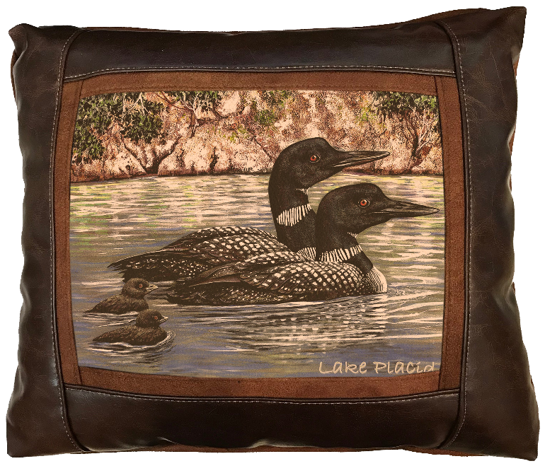Sweetwater Trading Company® artistic luxury leather pillows are handcrafted and made-to-order using only superior quality leather and faux leather fabrics. Artwork is always printed on genuine chamois leather, which gives the image a warm and beautifully aged appearance. A thin border of cognac brown faux suede leather surrounds the artwork. A bold, hickory brown fabric (available in genuine leather or faux leather) proceeds to frame the showpiece. Cognac brown faux suede leather comprises the welt and the back of the pillow.