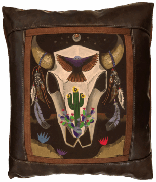 Sweetwater Trading Company® artistic luxury leather pillows are handcrafted and made-to-order using only superior quality leather and faux leather fabrics. Artwork is always printed on genuine chamois leather, which gives the image a warm and beautifully aged appearance. A thin border of cognac brown faux suede leather surrounds the artwork. A bold, hickory brown fabric (available in genuine leather or faux leather) proceeds to frame the showpiece. Cognac brown faux suede leather comprises the welt and the back of the pillow.