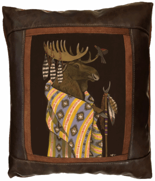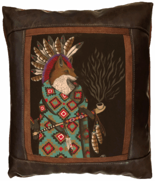 Sweetwater Trading Company™ artistic luxury leather pillows are handcrafted and made-to-order using only superior quality leather and faux leather fabrics. Artwork is always printed on genuine chamois leather, which gives the image a warm and beautifully aged appearance. A thin border of cognac brown faux suede leather surrounds the artwork. A bold, hickory brown fabric (available in genuine leather or faux leather) proceeds to frame the showpiece. Cognac brown faux suede leather comprises the welt and the back of the pillow.