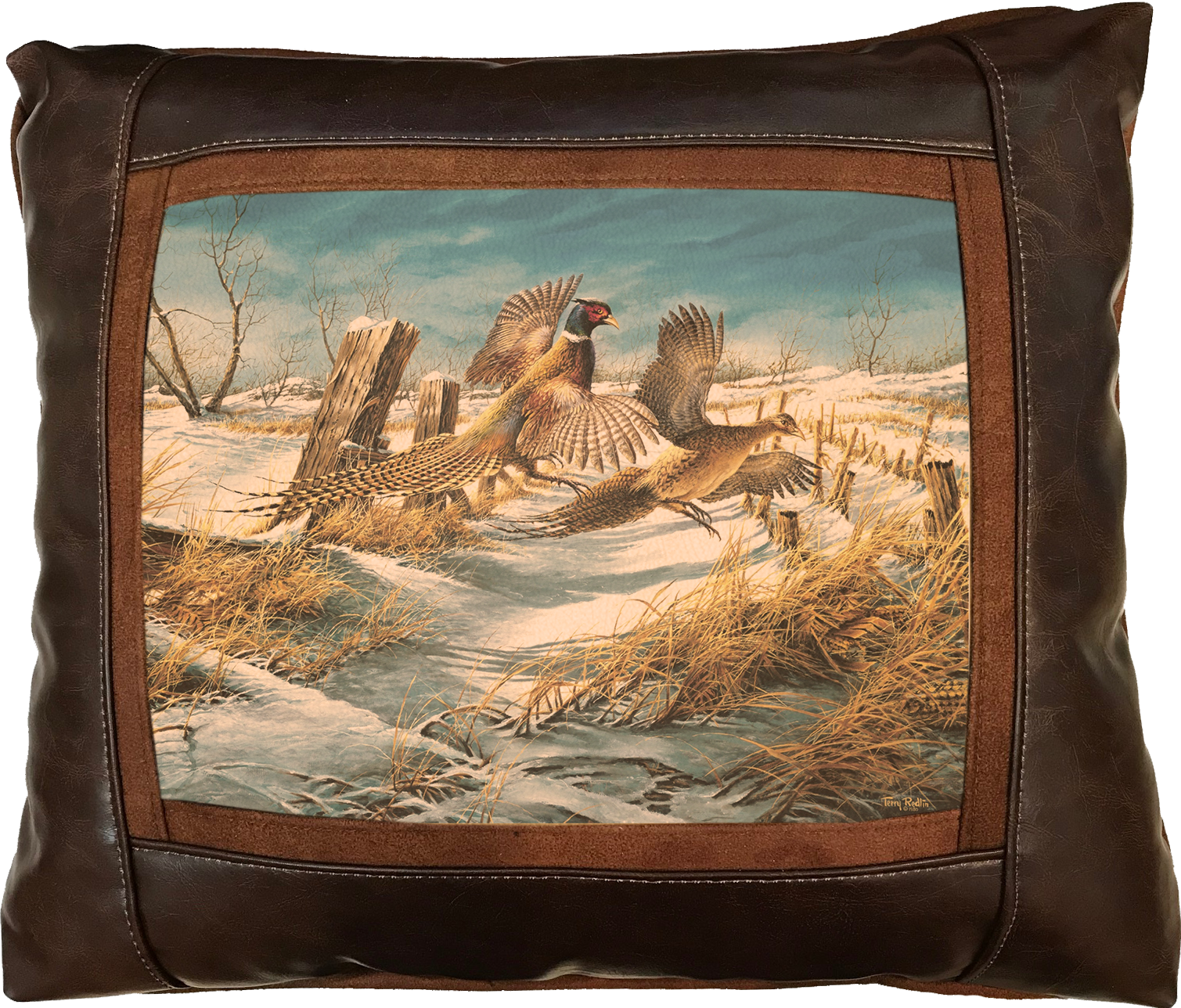 Sweetwater Trading Company® artistic luxury leather pillows are handcrafted and made-to-order using only superior quality leather and faux leather fabrics. Artwork is always printed on genuine chamois leather, which gives the image a warm and beautifully aged appearance. A thin border of cognac brown faux suede leather surrounds the artwork. A bold, hickory brown fabric (available in genuine leather or faux leather) proceeds to frame the showpiece. Cognac brown faux suede leather comprises the welt and the back of the pillow.