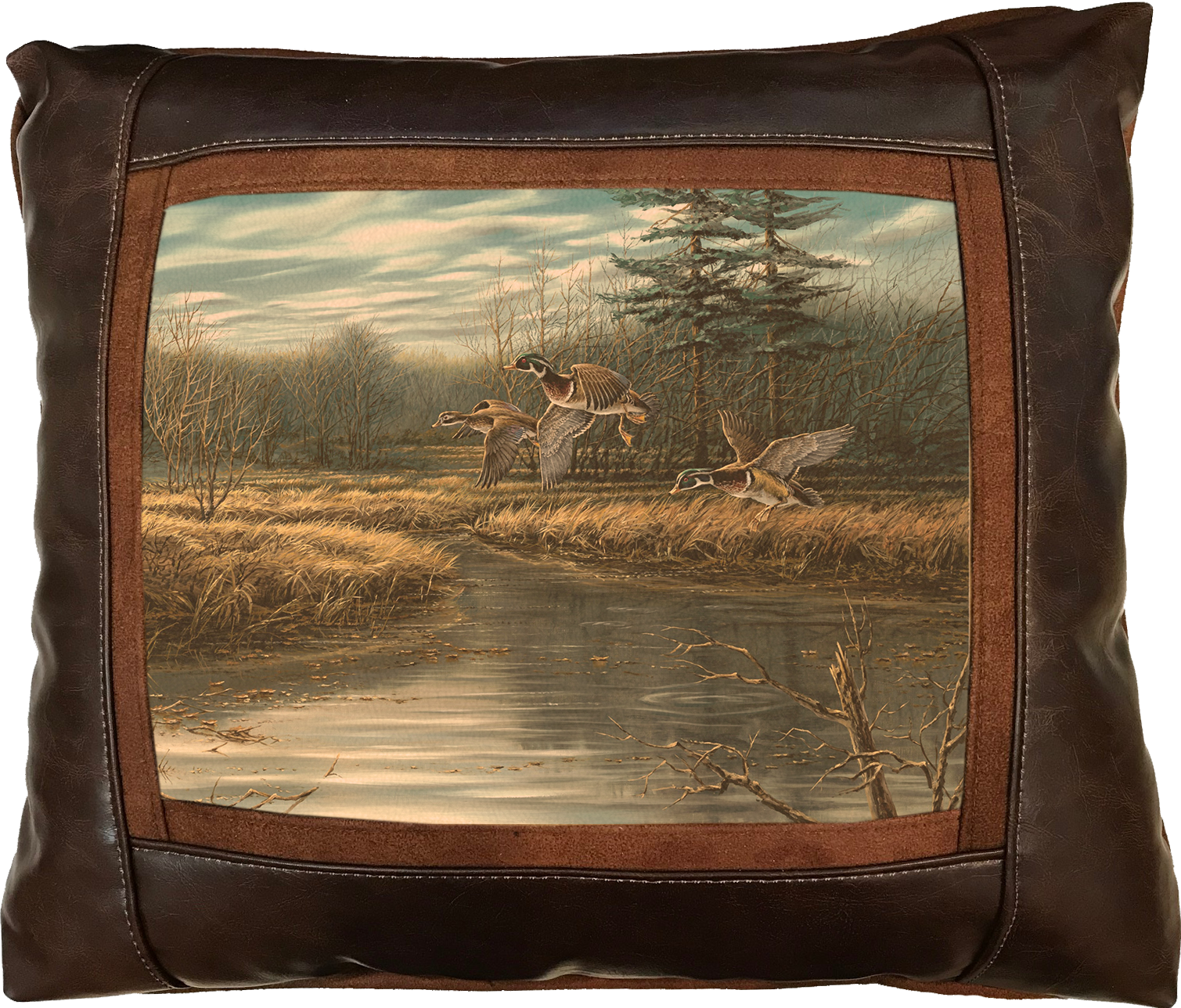 Sweetwater Trading Company™ artistic luxury leather pillows are handcrafted and made-to-order using only superior quality leather and faux leather fabrics. Artwork is always printed on genuine chamois leather, which gives the image a warm and beautifully aged appearance. A thin border of cognac brown faux suede leather surrounds the artwork. A bold, hickory brown fabric (available in genuine leather or faux leather) proceeds to frame the showpiece. Cognac brown faux suede leather comprises the welt and the back of the pillow.