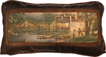 Sweetwater Trading Company® artistic luxury leather pillows are handcrafted and made-to-order using only superior quality leather and faux leather fabrics. Artwork is always printed on genuine chamois leather, which gives the image a warm and beautifully aged appearance. A thin border of cognac brown faux suede leather surrounds the artwork. A bold, hickory brown fabric (available in genuine leather or faux leather) proceeds to frame the showpiece. Cognac brown faux suede leather comprises the welt and the back of the pillow.