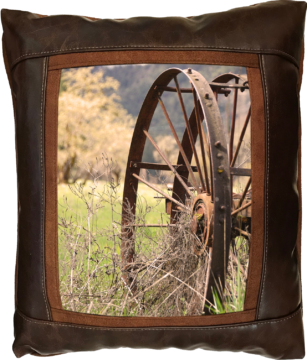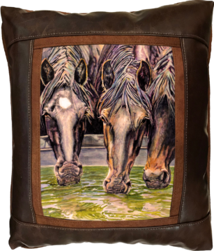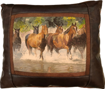 Sweetwater Trading Company® artistic luxury leather pillows are handcrafted and made-to-order using only superior quality leather and faux leather fabrics. Artwork is always printed on genuine chamois leather, which gives the image a warm and beautifully aged appearance. A thin border of cognac brown faux suede leather surrounds the artwork. A bold, hickory brown fabric (available in genuine leather or faux leather) proceeds to frame the showpiece. Cognac brown faux suede leather comprises the welt and the back of the pillow.