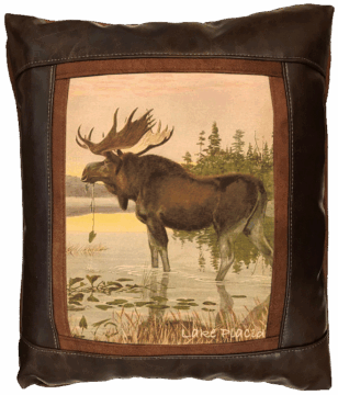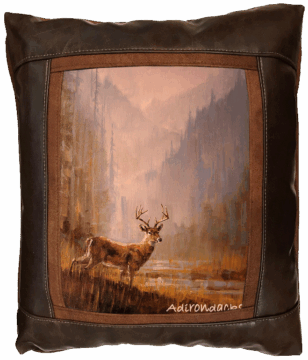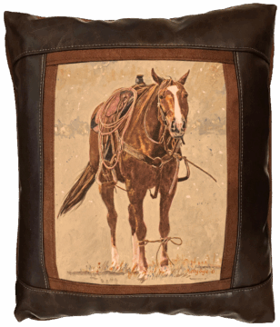 Sweetwater Trading Company™ artistic luxury leather pillows are handcrafted and made-to-order using only superior quality leather and faux leather fabrics. Artwork is always printed on genuine chamois leather, which gives the image a warm and beautifully aged appearance. A thin border of cognac brown faux suede leather surrounds the artwork. A bold, hickory brown fabric (available in genuine leather or faux leather) proceeds to frame the showpiece. Cognac brown faux suede leather comprises the welt and the back of the pillow.